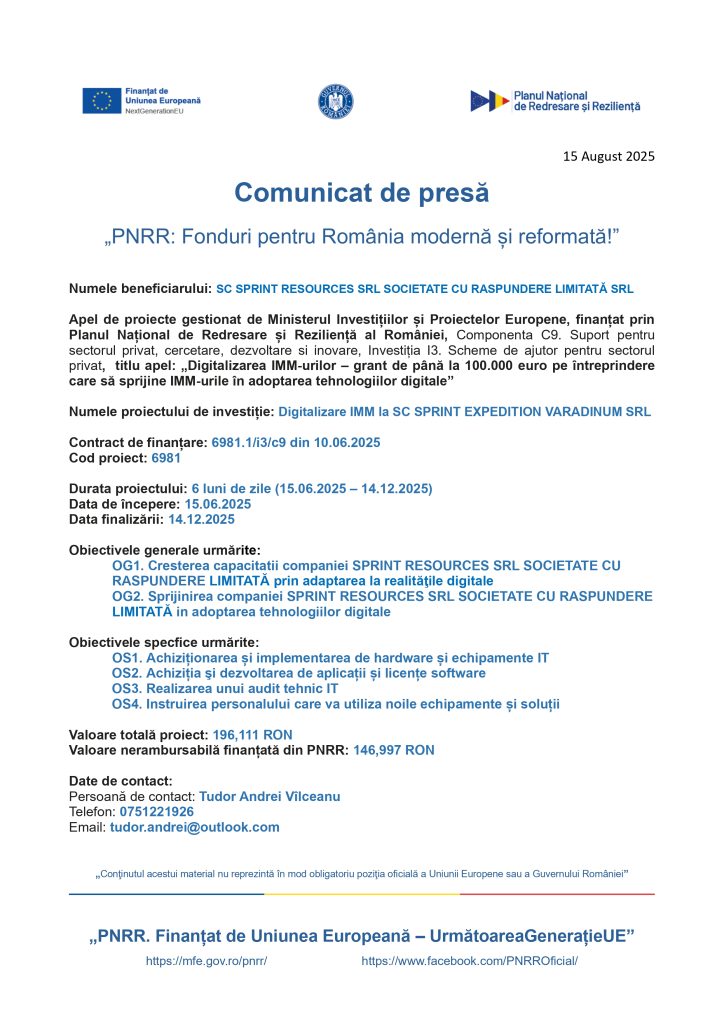 Numele proiectului de investiție: Digitalizare IMM la SC SPRINT EXPEDITION VARADINUM SRL